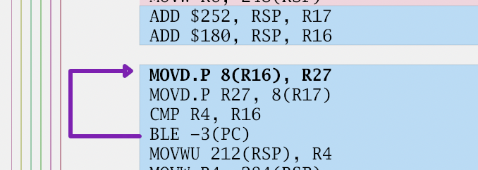 Unfortunately, the objfile library disassembler doesn't expose the information whether the instruction is a jump and when it jumps, then where to. I didn't want to dig too deep into this, so I reached for the usual tool for this – regular expression matching. It seemed that all the jumps ended with a hex number, such as JMP 0x123... of course, that approach broke. On arm processors, they look like BLS 38(PC). I added a special case for it for now, but it'll probably break again on some other platform.